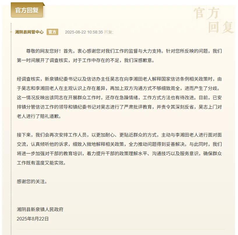 8月22日,湘阴县新泉镇人民政府回应称:“针对您所反映的问题,我们第一时间展开了调查核实。经调查核实,新泉镇纪委书记以及信访办主任吴某在向李某某老人解释国家信访条例相关政策时,由于吴某和李某某老人在主观认识上存在差异,再加上双方沟通方式不够细致周全,进而产生了分歧。这一情况反映出该同志在开展群众工作时,还存在急躁情绪,工作方式方法也有待改进。